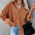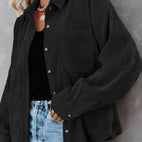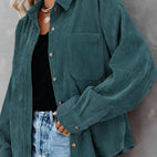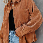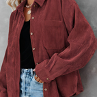 LaAmara chaqueta de pana con abotonadura?brinda unaforma relajada?y presenta uncuello, abotonado al frente y un bolsillo en el pecho.El dobladillo trasero un poco más largo ofrece cobertura extra. Úsala con pantalones cortos a juego o tus jeans favoritos.