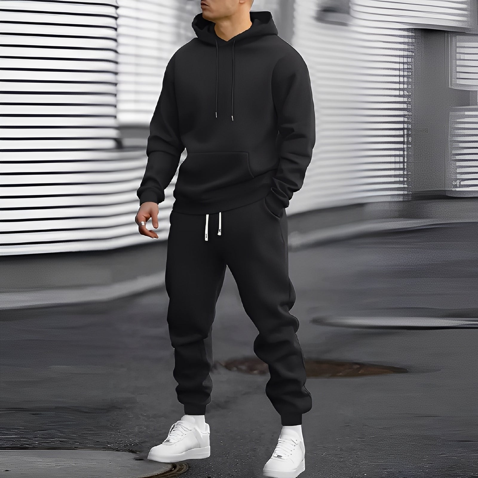 El traje de chándal Arvel mezcla un diseño deportivo con una comodidad relajada. Consta de una sudadera con capucha suave y pantalones a juego, proporcionándote libertad de movimiento y una agradable sensación al tacto. Ideal para entrenar, relajarse en casa o looks informales de streetwear, este conjunto es tanto versátil como cómodo y estilizado.
